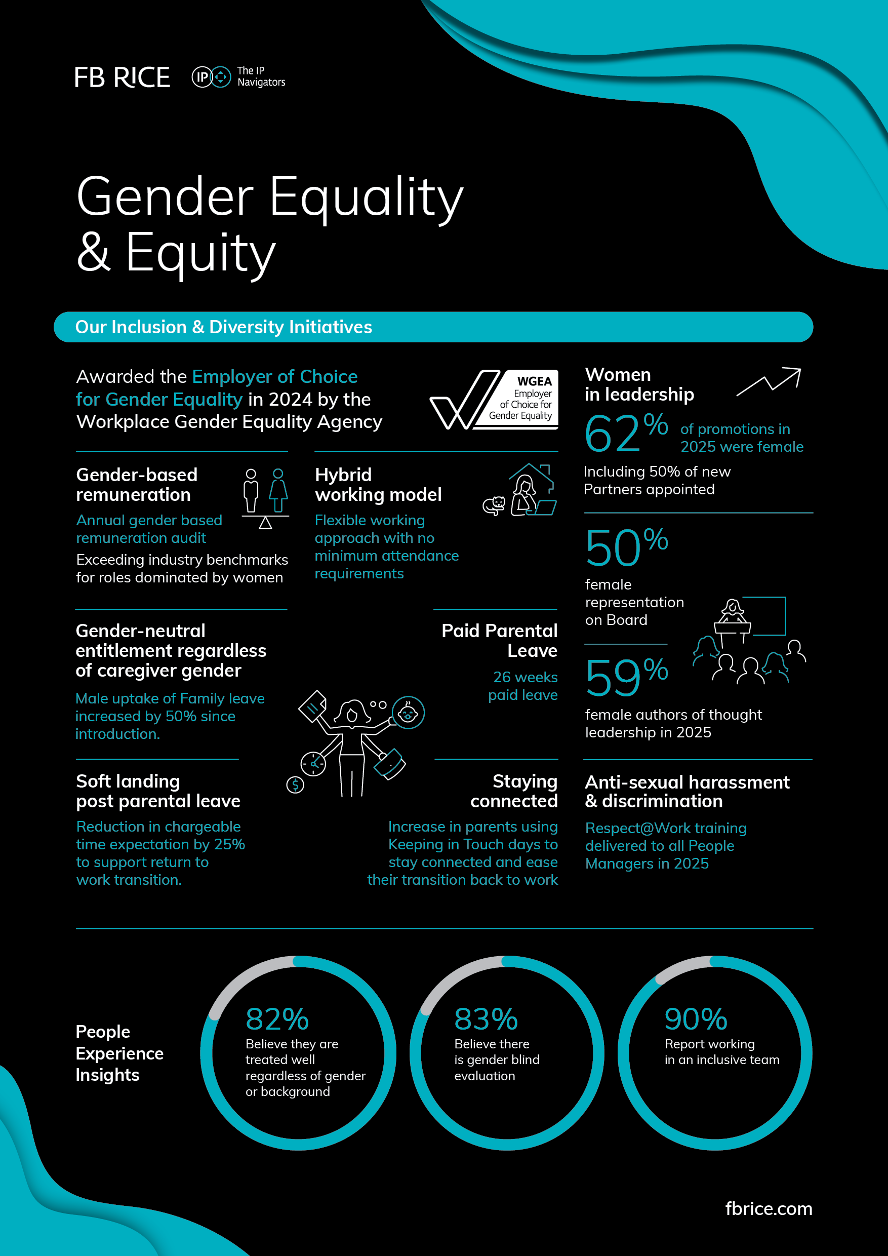 Before joining FB Rice, Kath was a client. While on parental leave from her role as Head of Patents at a listed tech company, she needed a secondment arrangement that would ensure consistency and progress on strategic objectives. Beata worked closely with Kath to tailor a solution that met the business’s needs. The arrangement wasn’t off-the-shelf; it was designed to fit the client’s context, ensuring the IP function remained consistent and effective during a period of transition. This collaboration reflects FB Rice’s culture of client centricity – where solutions are shaped around client needs, not the other way around.